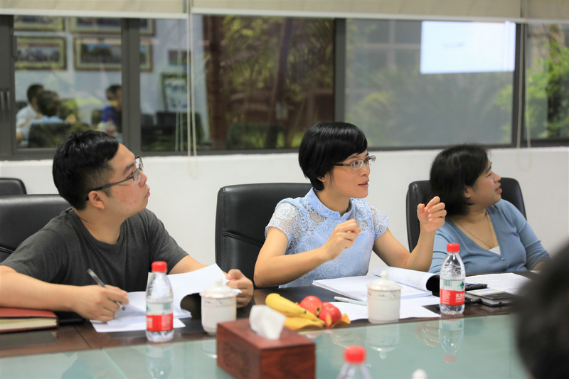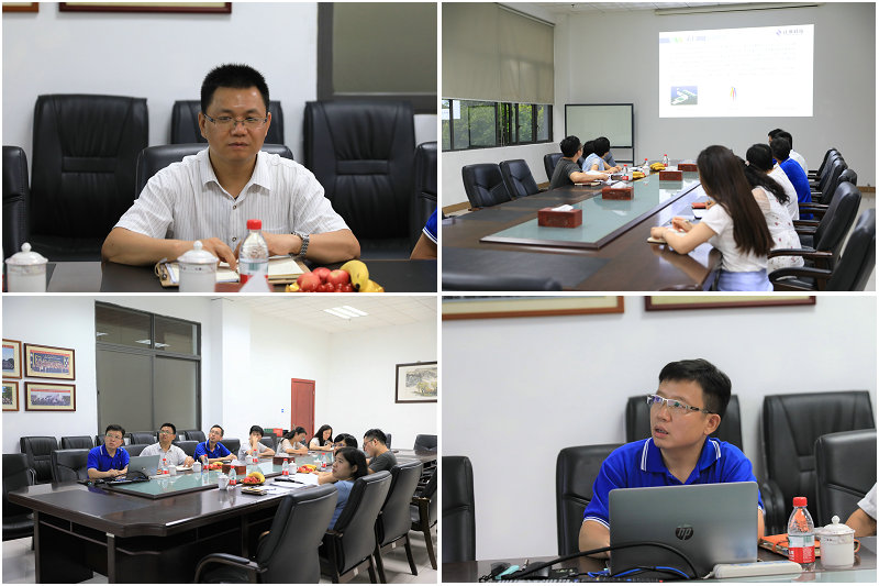 ▲松山湖科創(chuàng)局領(lǐng)導(dǎo)討論項目市場應(yīng)用情況