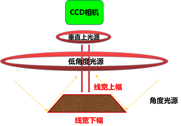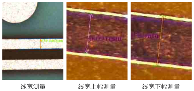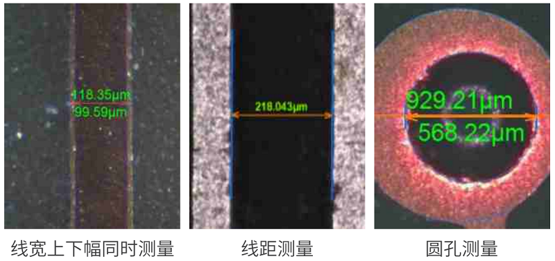 通過影像成像系統(tǒng)及光源從上表面垂直于被測板,呈顯影像(相機實時拍圖)感測,并將圖像傳送至電腦測量軟件,通過軟件測量工具分析圖像的“線寬/線距/線寬上下幅/圓/金手指線寬等”標(biāo)準(zhǔn)公差值對比,從而判斷被測板上的測量值OK或NG。