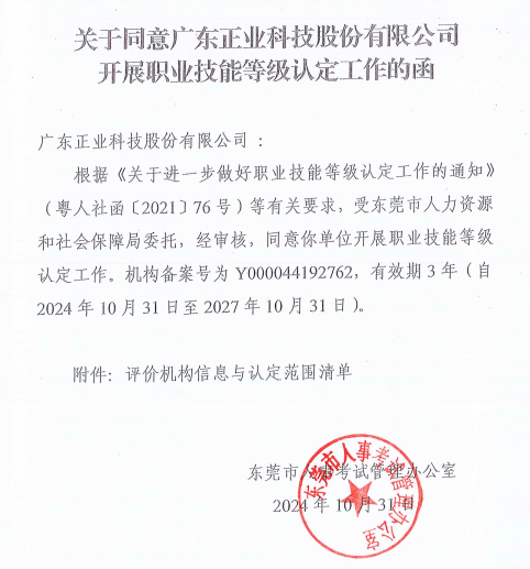 近日,廣東正業(yè)科技股份有限公司(以下簡(jiǎn)稱(chēng):正業(yè)科技)收到了東莞市人事考試管理辦公室“關(guān)于同意廣東正業(yè)科技股份有限公司開(kāi)展職業(yè)技能等級(jí)認(rèn)定工作的函”。這標(biāo)志著公司順利完成了職業(yè)技能等級(jí)認(rèn)定備案工作,開(kāi)啟了公司技能人才隊(duì)伍培養(yǎng)與認(rèn)定的新篇章。