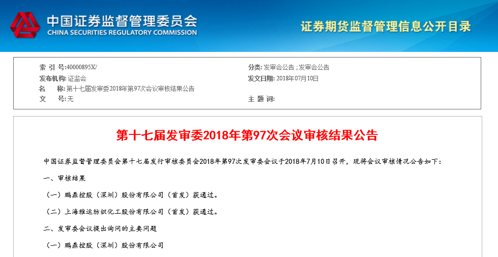 據(jù)證監(jiān)會7月10號發(fā)布的《第十七屆發(fā)審委2018年第97次會議審核結(jié)果公告》顯示,為正業(yè)科技2017年度第一大客戶的鵬鼎控股(深圳)股份有限公司(以下簡稱“鵬鼎控股”)首發(fā)申請獲通過。